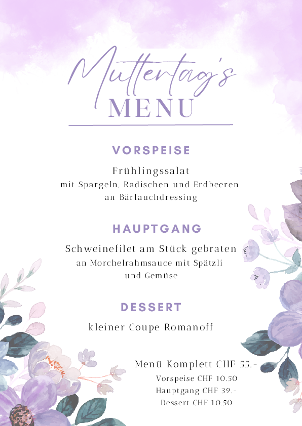 Gerne können Sie aus unserer Speisekarte auswählen oder Sie entscheiden sich für unser spezielles Muttertagsmenü, ganz wie Sie möchten.