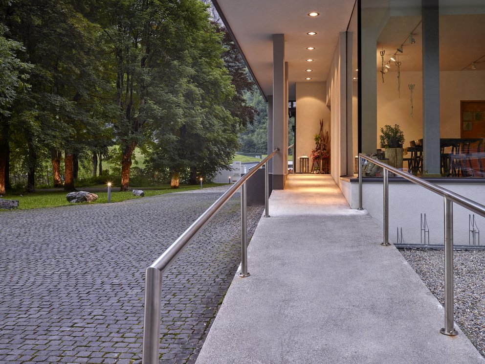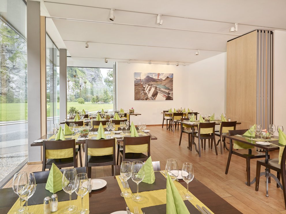 Unser frisch renoviertes, helles Restaurant mit 60 Plätzen bietet unseren Gästen mit seinen grossen Fensterfronten einen eindrucksvollen Blick auf die steilen Felswände, in die unser Haus eingebettet ist.